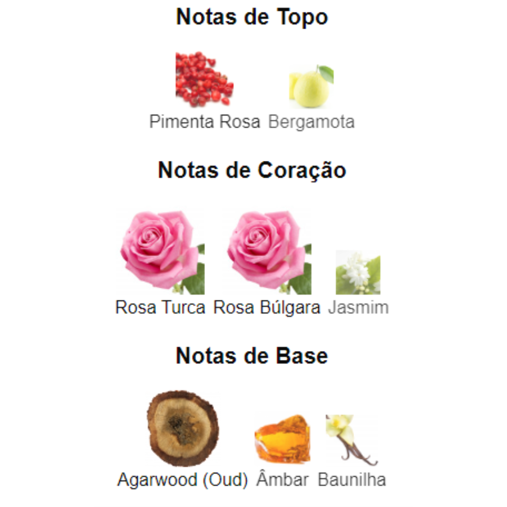 Notas de coração : Rosa Turca, Rosa Búlgara e Jasmim
